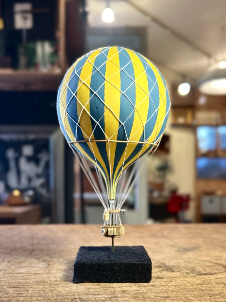 何となくお祭りぽい気球の置物。素性は不明でしたが細かな良い出来、浮遊感の見せ方もよろしおす。高155 球径 80 台座50ミリ角 sold