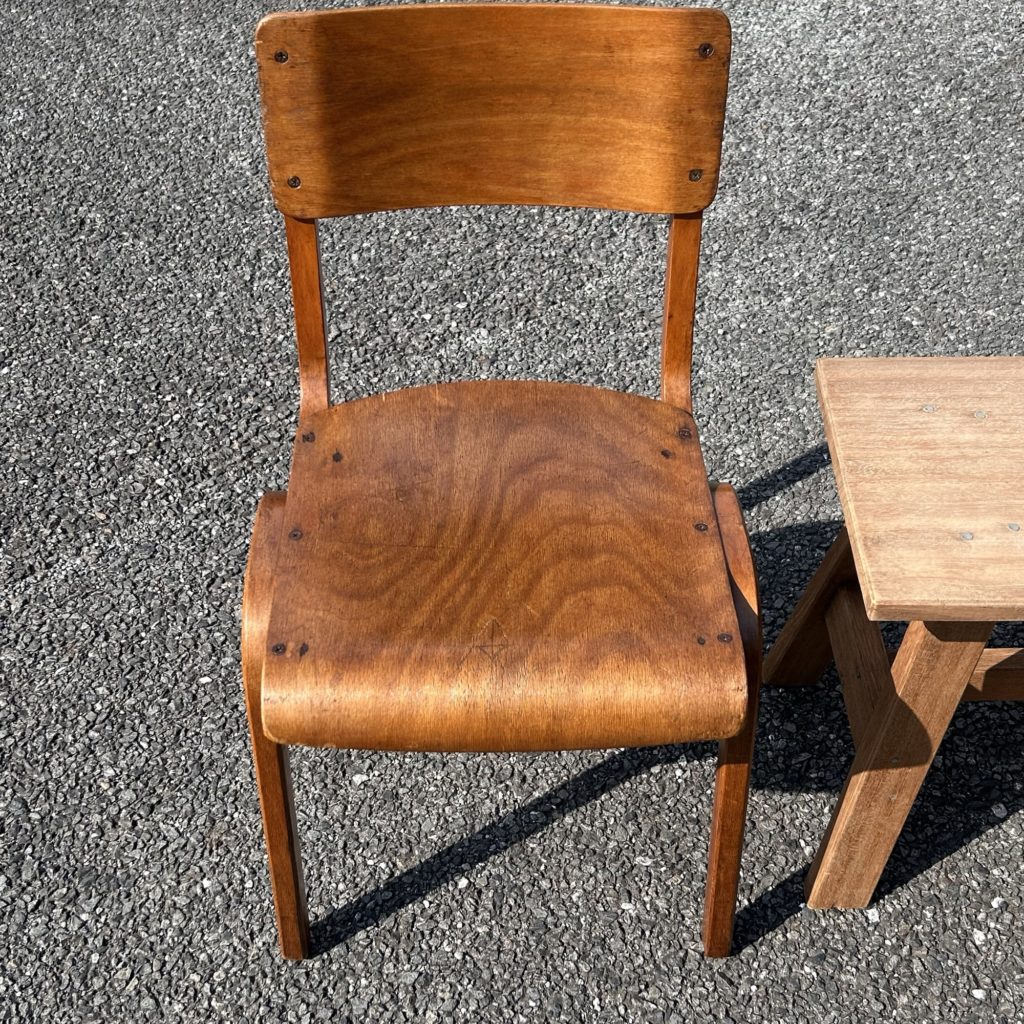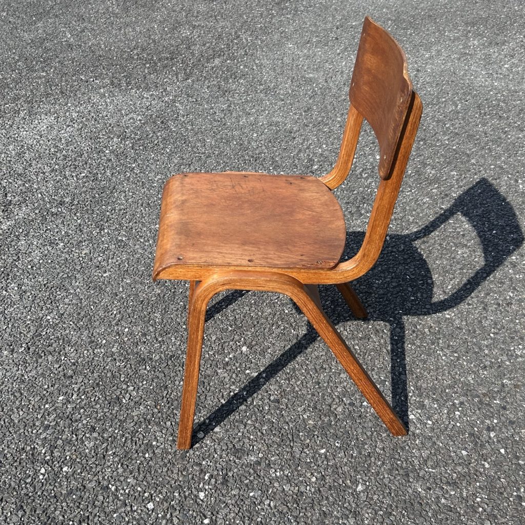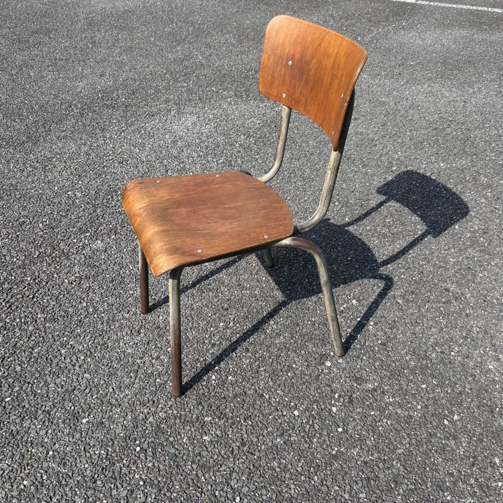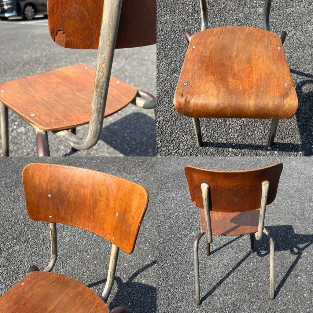 少々くたびれ気味では有りますが、構造的にはまだまだお使い頂けそうです。スクールチェアとはいえ座高はほぼ日本規格ですので通常のテーブルにも合わせてお使い頂けるサイズ感、脚部も曲木製で軽いです。