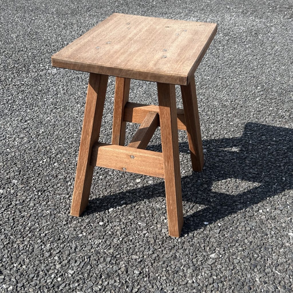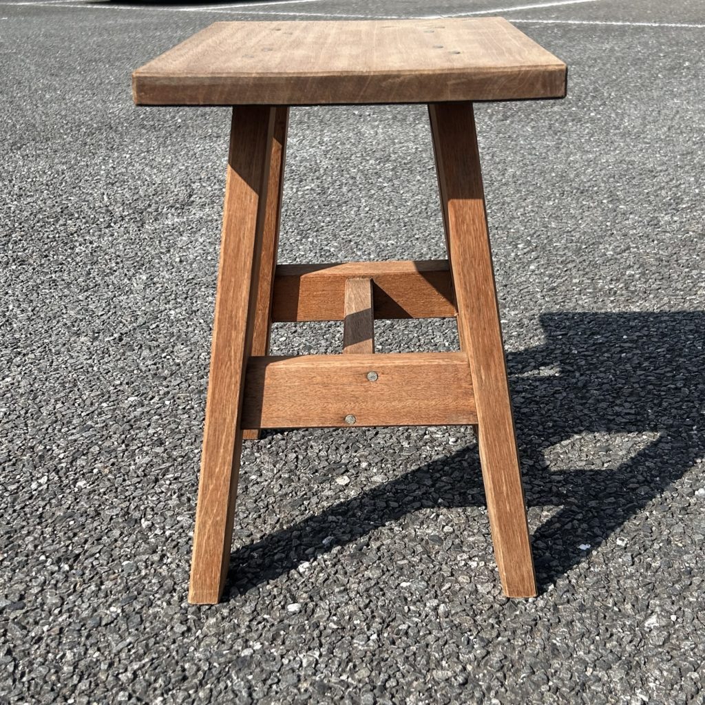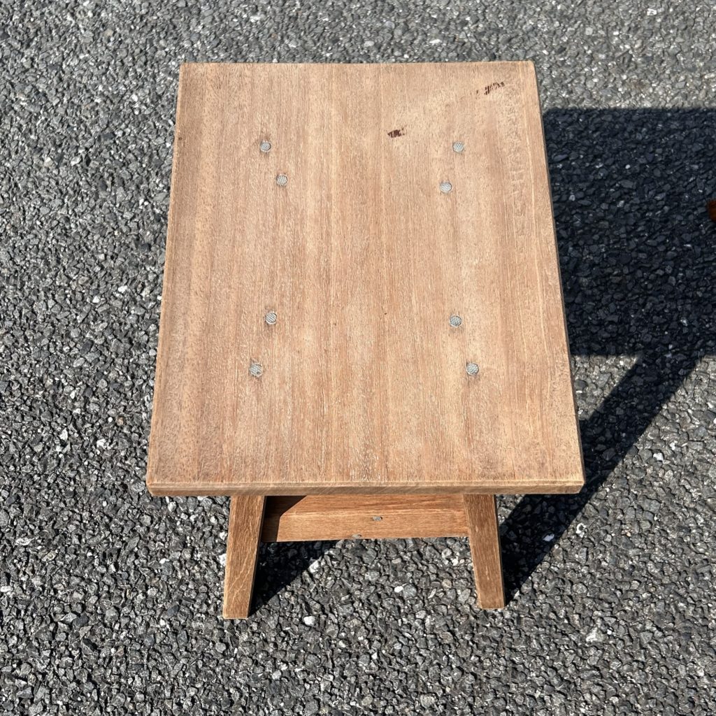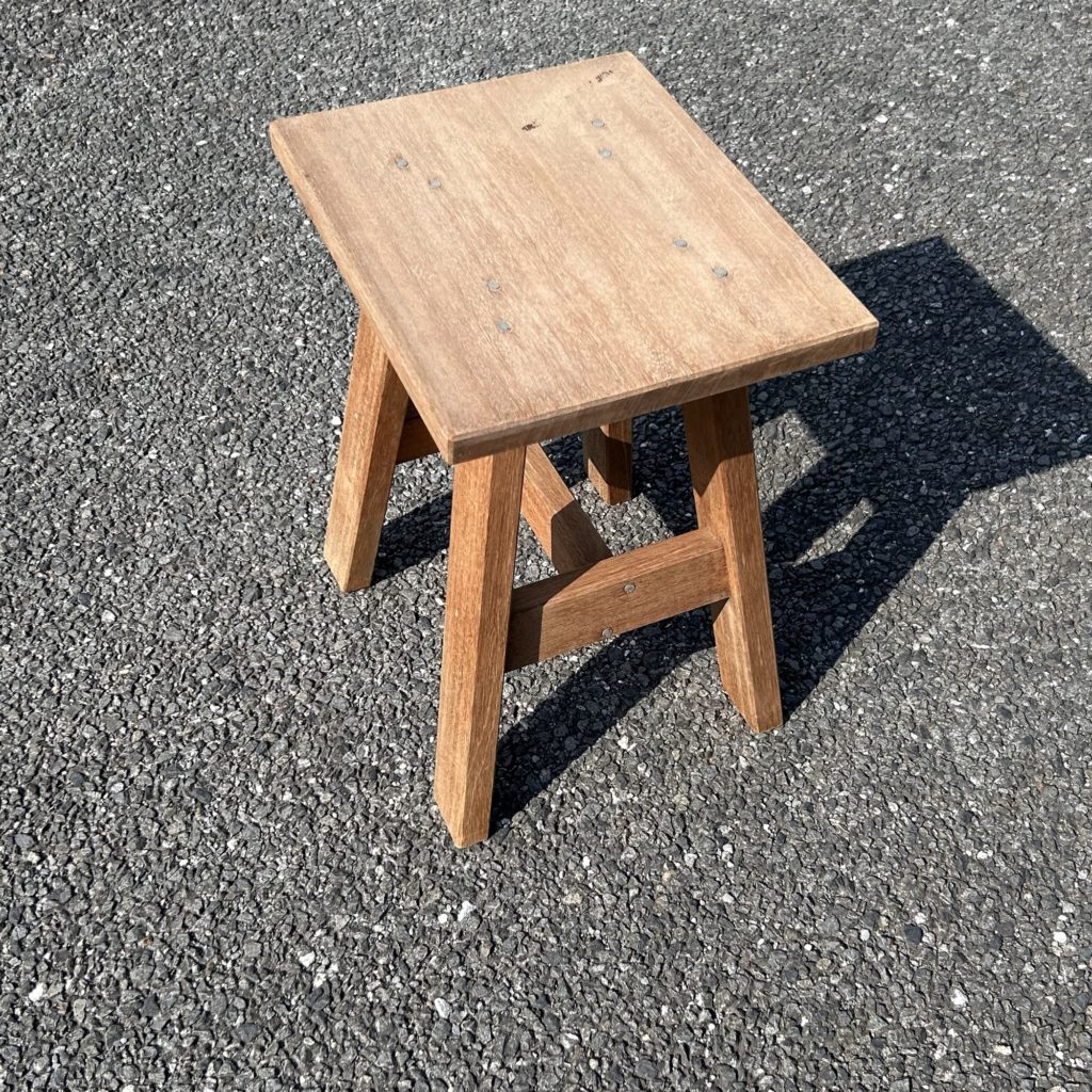 ハの字テーパー脚とプロポーションが可愛らしく、比較的心得がある方がラワン材でささっと作った様な印象。太釘でバシッと留める手法も何だか新鮮です。造り的には台 テーブル用途でしょうが、高さ構造の強さ的にはスツール 腰掛け使用でも構わないと思います。ざっくりクリーニングしたのみの素の木地状態です。何らか表面 色処理をご希望の方はご相談ください。