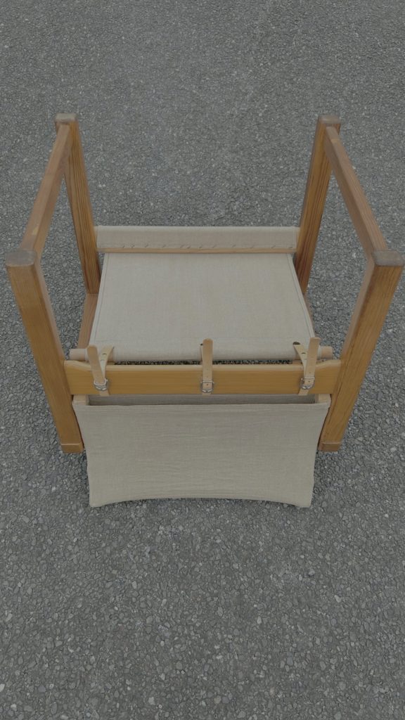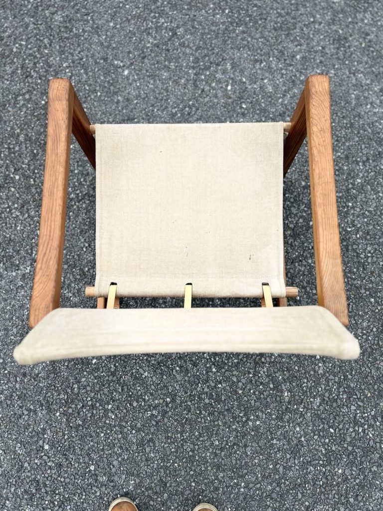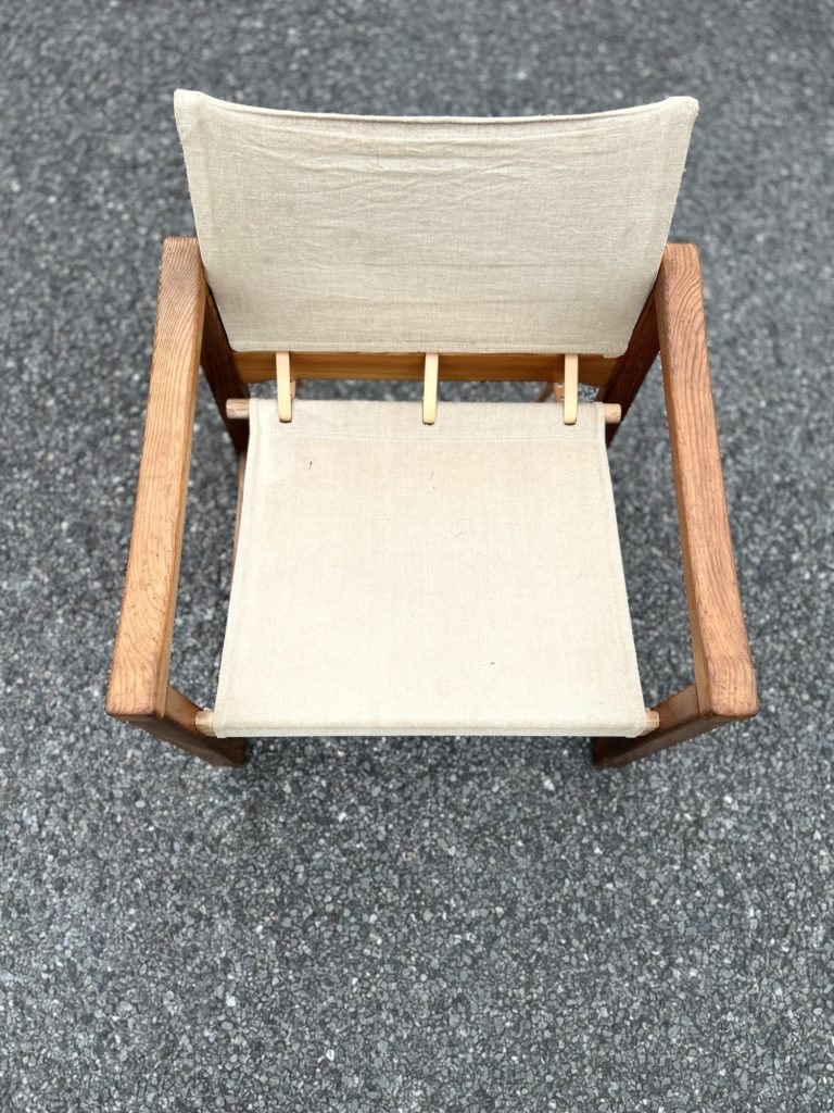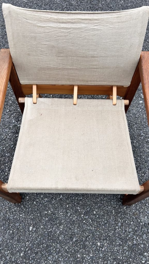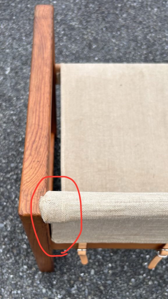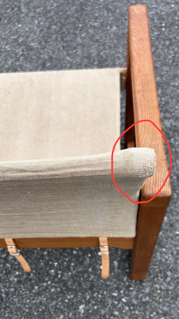一度全バラししまして、麻のファブリックを外しクリーニングし、傷みが有った箇所(画像9.10)の補修をお願いしました。現在でもシミや焼けなど取り切れなかった痕跡がございます。ざっくりした強そうなリネンでは有り現状座れますが、恐らく50年近く経つ生地ですのでハードなお使い方は避けて頂けたらと思います。