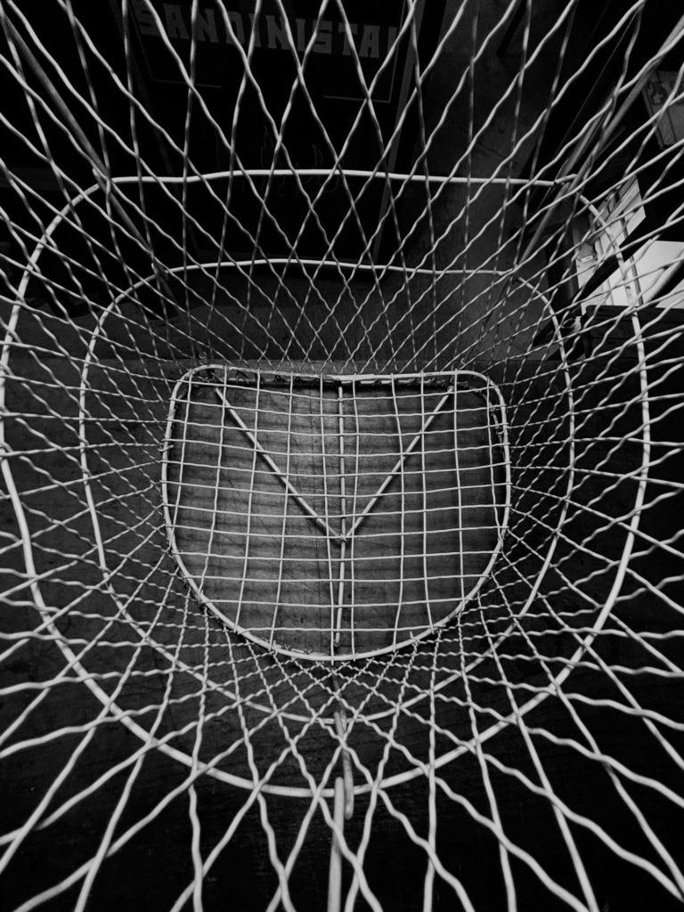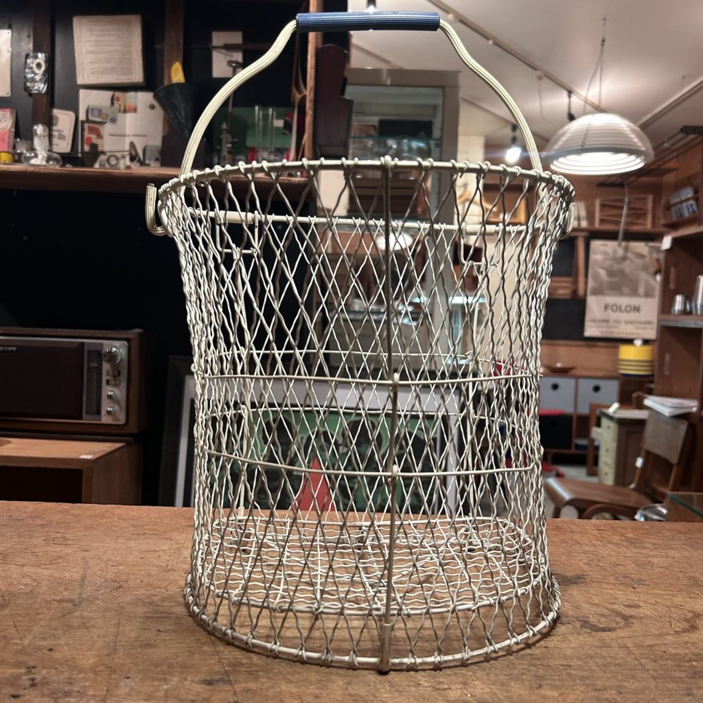 今日はガラッと変わってこちら。洗濯カゴの中でも初期型ではなかろうか、細い皮膜ワイヤーで編まれた味わい深きひと籠。脱水機など無い時代、端にハンドル×ローラーでグリグリ絞り上げる仕組みが付いていた時代、そのローラーの下にセット出来るよう背面にフック受けが用意されています。多分昭和30年代後半頃。そんなだいぶお達者さんなのですが、解れや目立つ錆 ワイヤー切れは見当たらず。流石にプロポーションはヨレ気味では有りますがまだまだ現役で頑張ります。w/約300 d/240 h/ 260ミリ sold