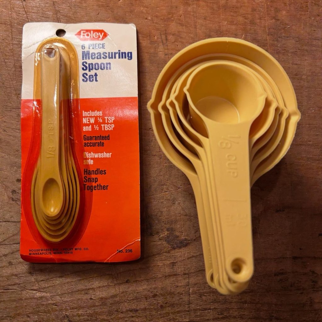 ふたつめ、どちらもUSメイドの計量スプーンセット2種。こちらは70’s後半頃かな、マスタード色が流行っていたのかな好きだな。どちらもセットで1.000-で宜しくお願いします。