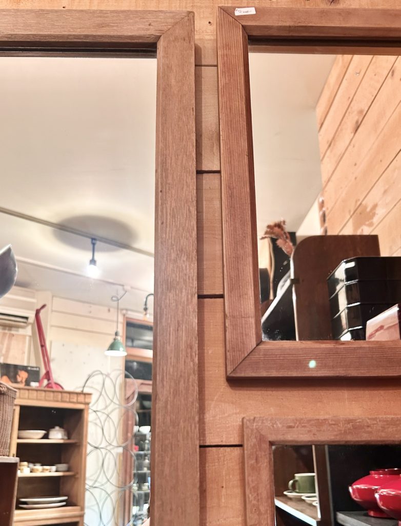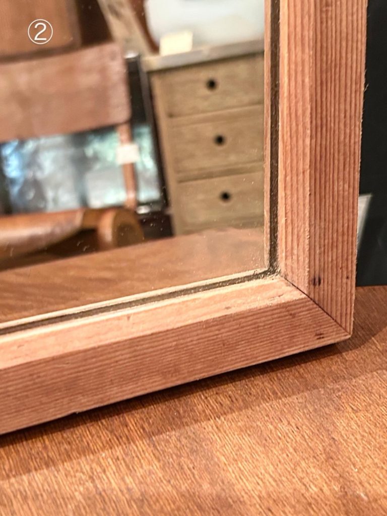 鏡って大体枠へこってり艶あり塗装が施されている物がほとんどの様に思いますが、こちらは杉か檜の柾目材を使っていて、素の生地のままっていうのが良いなと思いました。また、材 サイズの割に重めなので厚手の鏡を使っている様に思います。ガラス部は時々ピンポイントで裏側の変質が見られますが、広範囲での曇りなどの変質はございません。