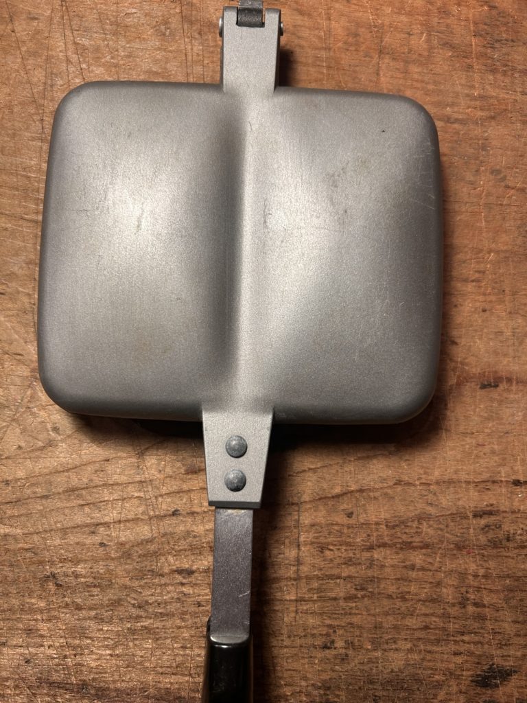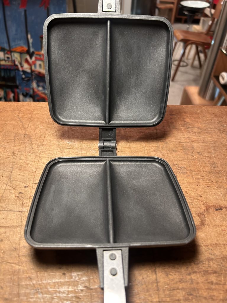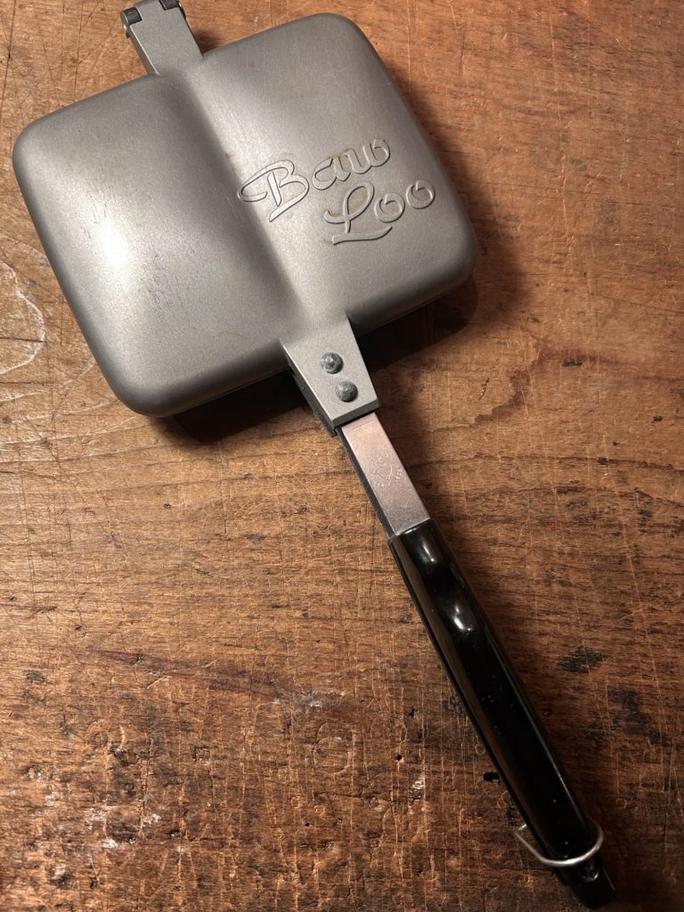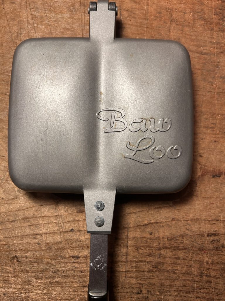 個人的に思い出深いアイテムで、わたくしが多分小学生(1970年代中盤辺りか)の頃、近所の公園に時々行商やポン菓子や紙芝居なんかがやって来て近辺の方々が集まる事があり、ある時このバウルーを売りに来まして、普段はこういう一見胡散臭い物には目もくれず一貫して質素な母が気前よく購入したのでした。バタ臭い海外物感が家にやって来たのが妙に嬉しかったわたしは一時期自分で色々作って食べていました。バナナを挟んだのが意外と好きだったな。料理の原体験かも。そして最近市場でバウルーの出物があり、当時のオリジナルを入手し自宅飯で時々楽しんでおりますが、挟む前に温めた器具側にしっかり油を回しておかないとほぼくっつくのが唯一面倒なとこ、あと焦げ付くと厄介。
