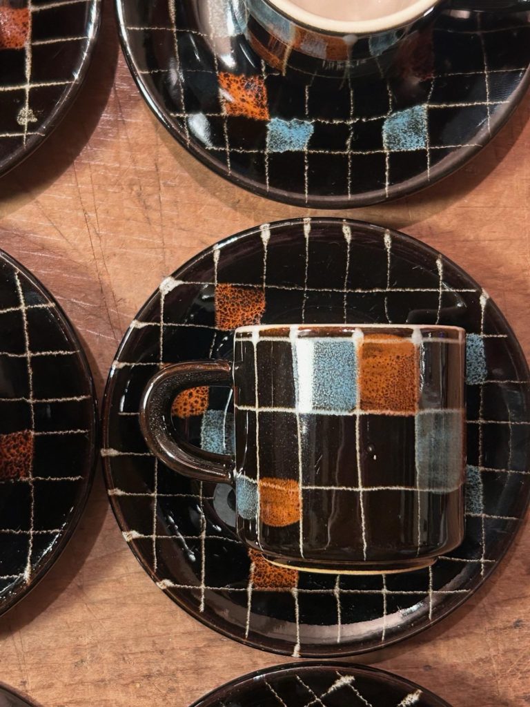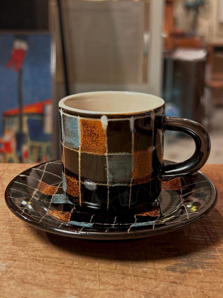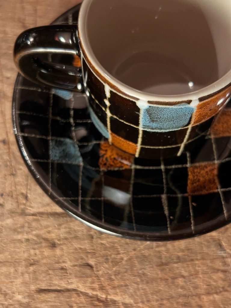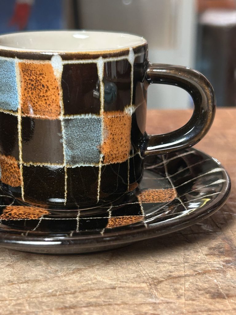 三重県 御浜焼 / みはまやき のC&S、小振り(100ml程)なデミタスサイズです。持った印象は硬質で重め、冷め辛そうです。クレヨンの落書きの様ないなたい柄が可愛らしいです。残念ながら御浜窯は現在消滅しています。