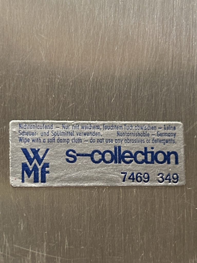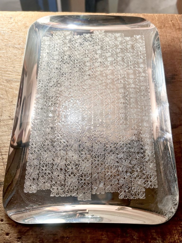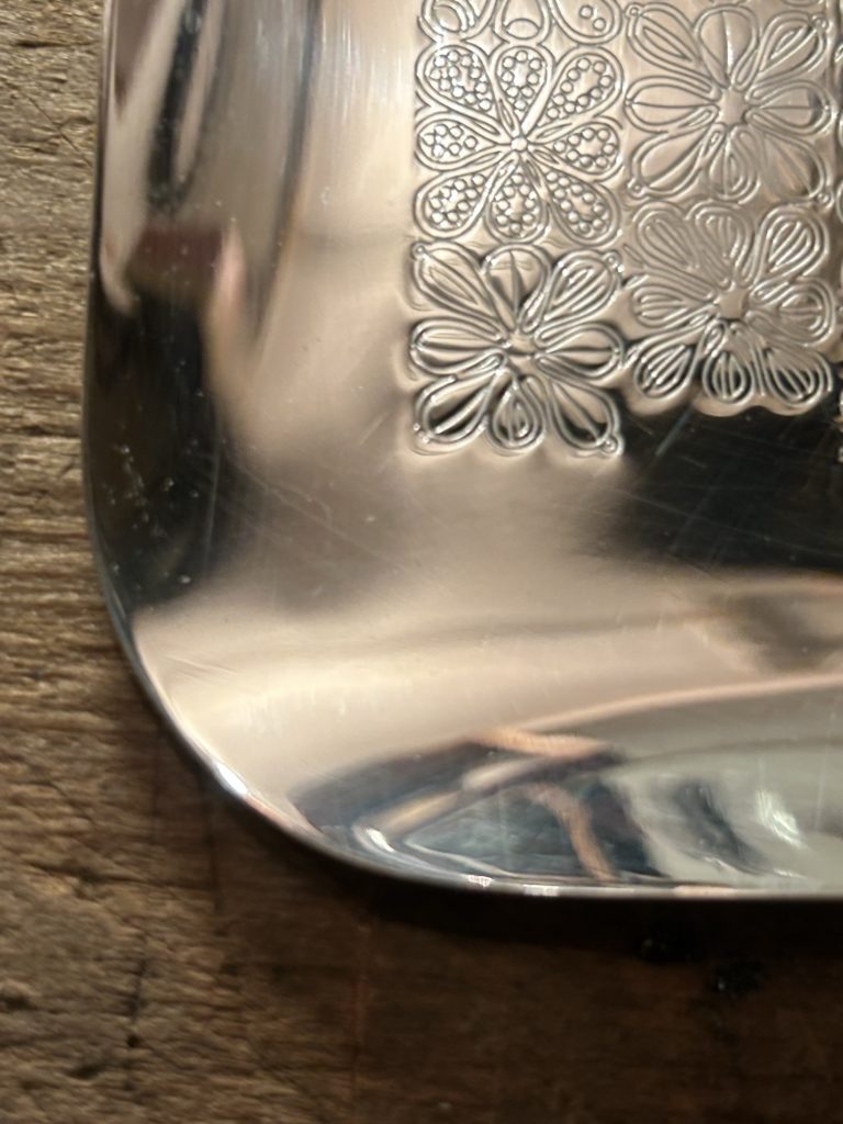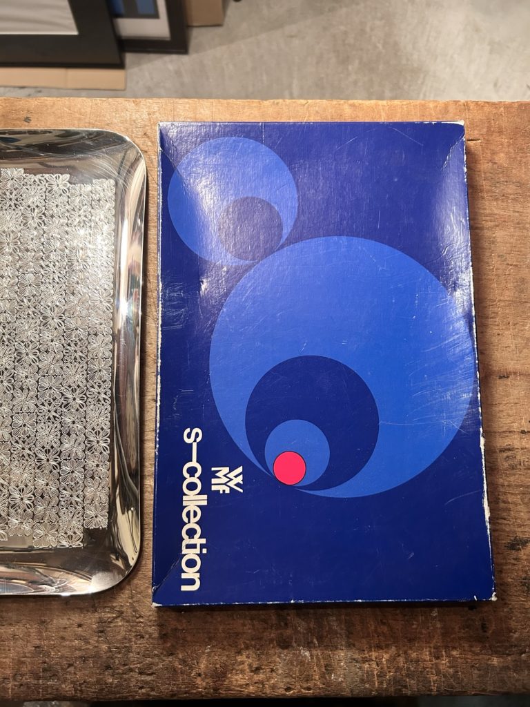 バウハウスとも繋がりのある、ドイツの老舗金属製品メイカーwmf / s-collection からのメタルトレー。連続する細かな花弁モチーフの様なパターンが可愛らしすぎずいい塩梅。未使用品ぽく出てきてますが、真鍮へ銀メッキ仕様の表面一角に腐食痕が有りましたのでやむ無く磨きをかけだいぶ緩和致しましたが、光の加減で目立つかもしれません。オードブル皿的な使い方 小間物を置くコイントレー ただ飾る などお好きにどうぞ。だいぶ草臥れて来てますが元箱もございます。