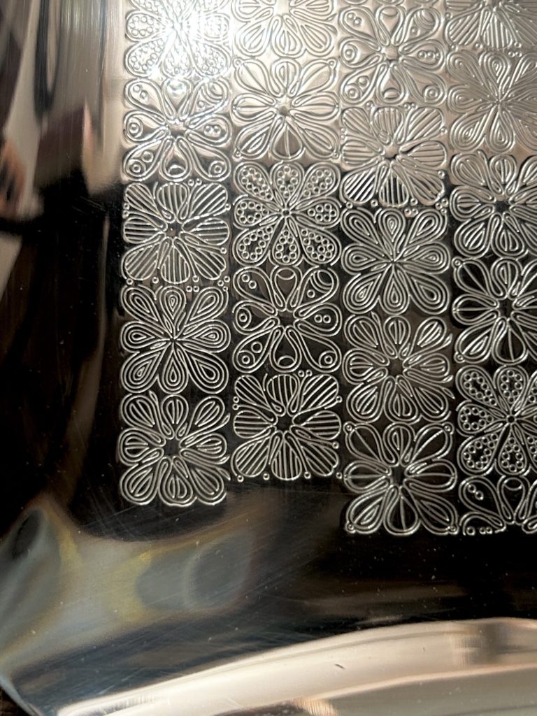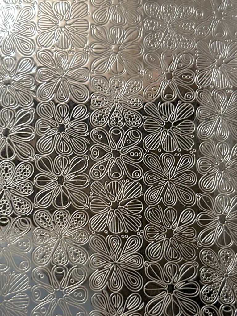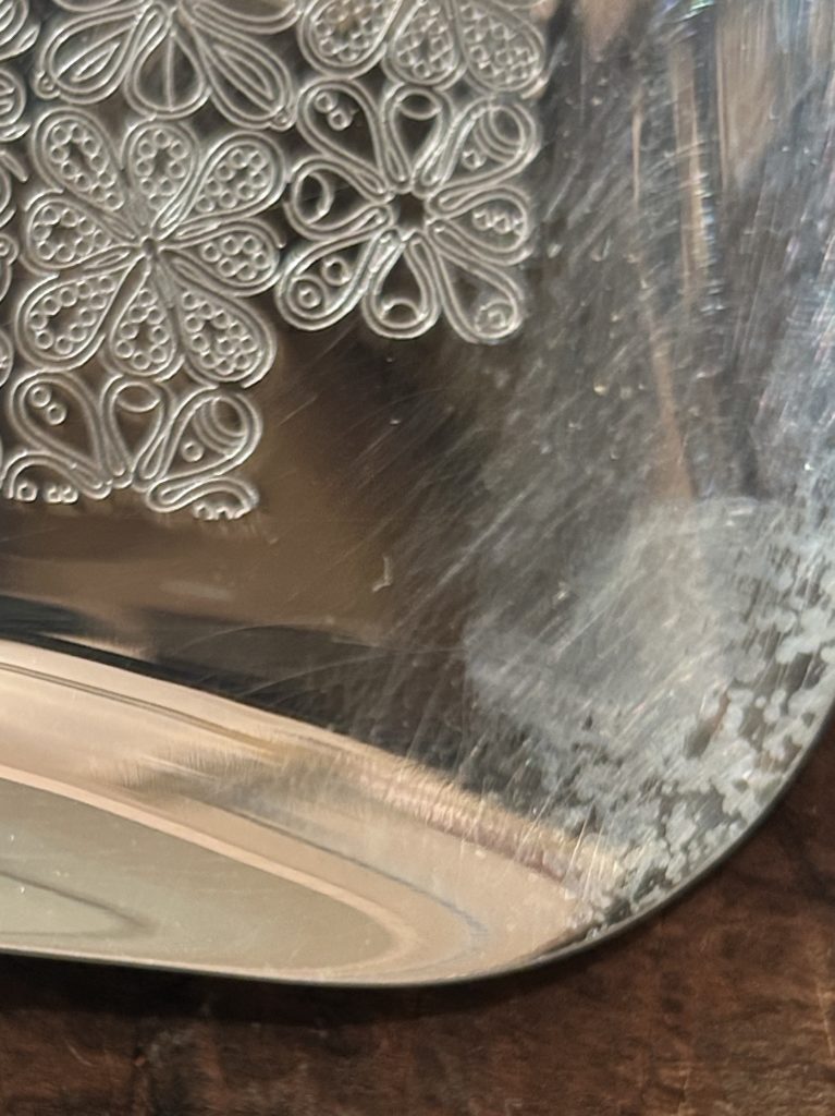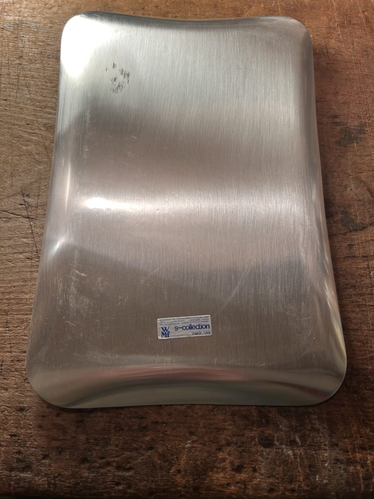 バウハウスとも繋がりのある、ドイツの老舗金属製品メイカーwmf / s-collection からのメタルトレー。連続する細かな花弁モチーフの様なパターンが可愛らしすぎずいい塩梅。未使用品ぽく出てきてますが、真鍮へ銀メッキ仕様の表面一角に腐食痕が有りましたのでやむ無く磨きをかけだいぶ緩和致しましたが、光の加減で目立つかもしれません。オードブル皿的な使い方 小間物を置くコイントレー ただ飾る などお好きにどうぞ。だいぶ草臥れて来てますが元箱もございます。