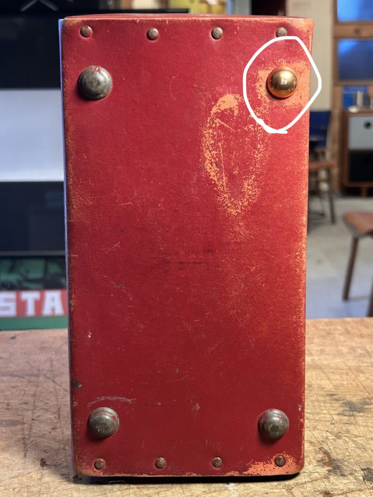 スライド映写機のキャリーケース。60’sの富士フィルム製、中身本体は抜きました。ボテ箱マナーに則り細かく丁寧に作られ良い味に仕上がっております。個人的に好きな素材の硬質パルプ、簡単に言うと圧縮し強度を出した紙なんですけど使い込むと革の様な風合いが出て来ます。加えてエッジや角に補強の金具があしらわれてるの萌えです。内部はパーツ整理の為2箇所ポケット的な仕切りが付いています。底部の丸脚金具がひとつ欠品していました。現状は太鼓鋲(6枚目 白丸)を仮付けしていますが、ストックから良いやつを見つけますので暫しお待ち下さい。