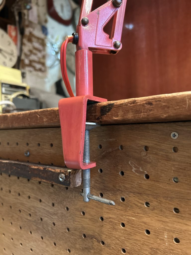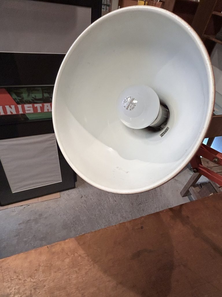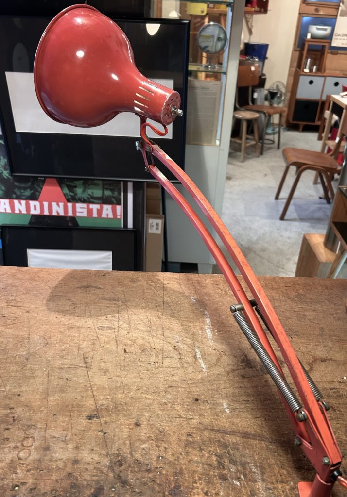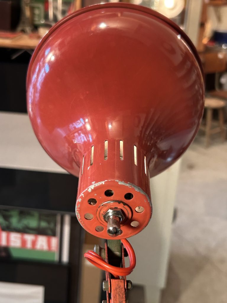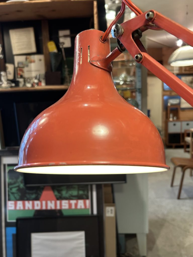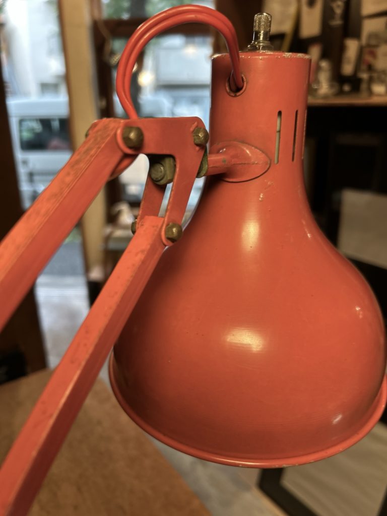 恐らく60’sの山田照明のデスクライト今ではあまり見かけない1本腕タイプです。2本アーム程リーチの自在さは有りませんが、間接照明やお手許の灯りくらいのご用でしたらむしろコンパクトなこちら。ソケットはE26 LEDオッケーでカチカチ回す回転スイッチがシェード上部にございます。元はもう少しビビッドな赤系であったのでしょう、経年と退色でくすんだエンジ色へ、また錆痕等のダメージもございます。この頃の風潮だったのでしょうか、本体色と合わせてコードも赤なのが時代の熱量を感じます。