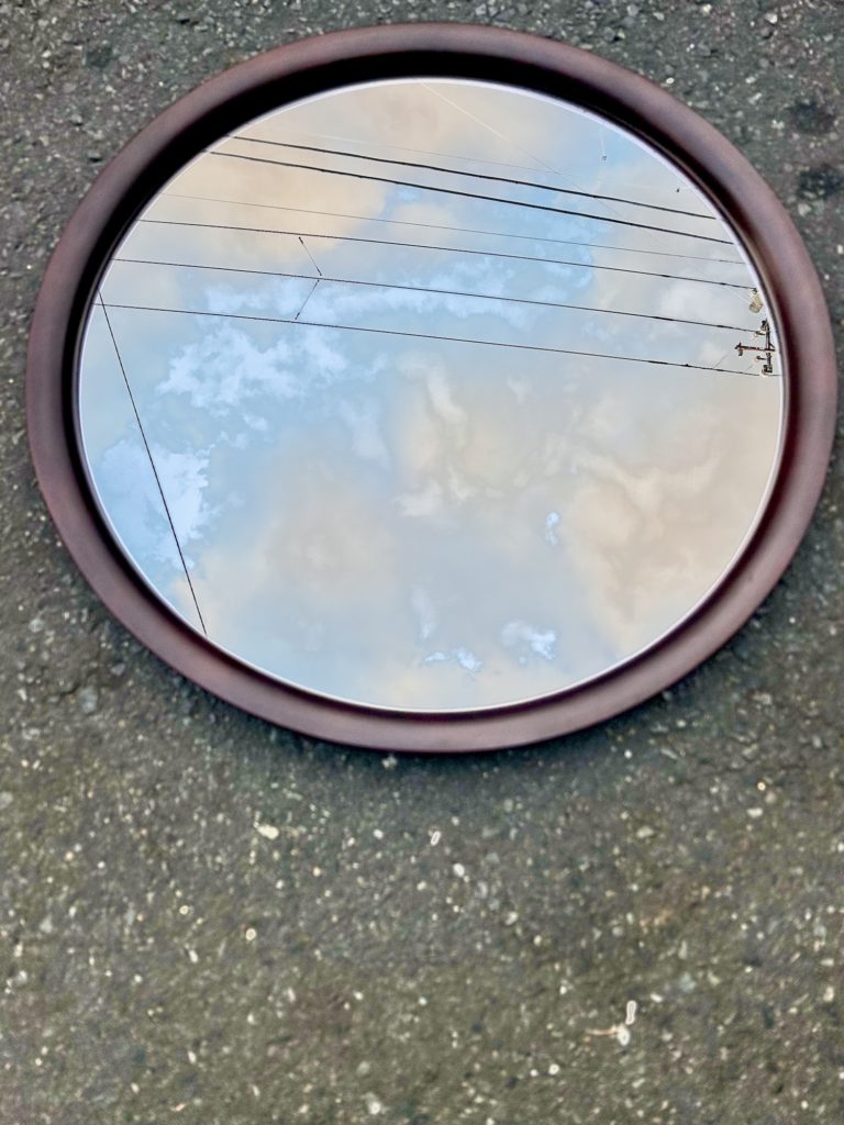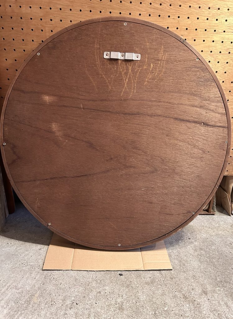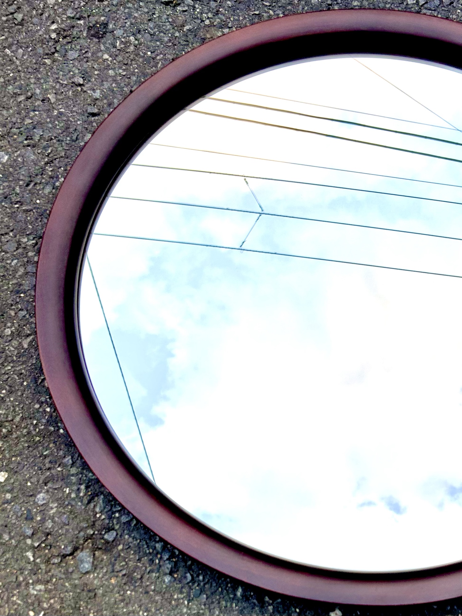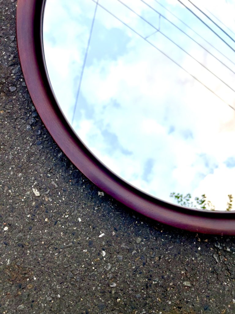 柳宗理氏の丸ミラー 大。秋田木工の現行とはサイズが微妙に違いますので、少々前のモデルになるのでしょう。カラーは赤味のある古代色。