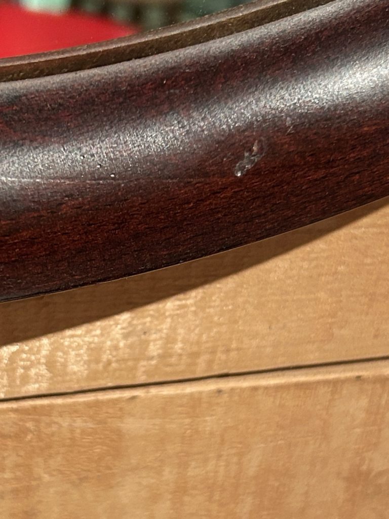 フレーム部に何箇所か凹み痕 スレ傷があり、オイルステインでタッチアップ致しました。また鏡面は内側からの曇りは無く綺麗ですが、右脇に3センチ程の細い傷がございます(画像最後)。秋田木工のデカールは外れており ございません。裏側はそれなりな使用感 傷 年季が入ってはおります。