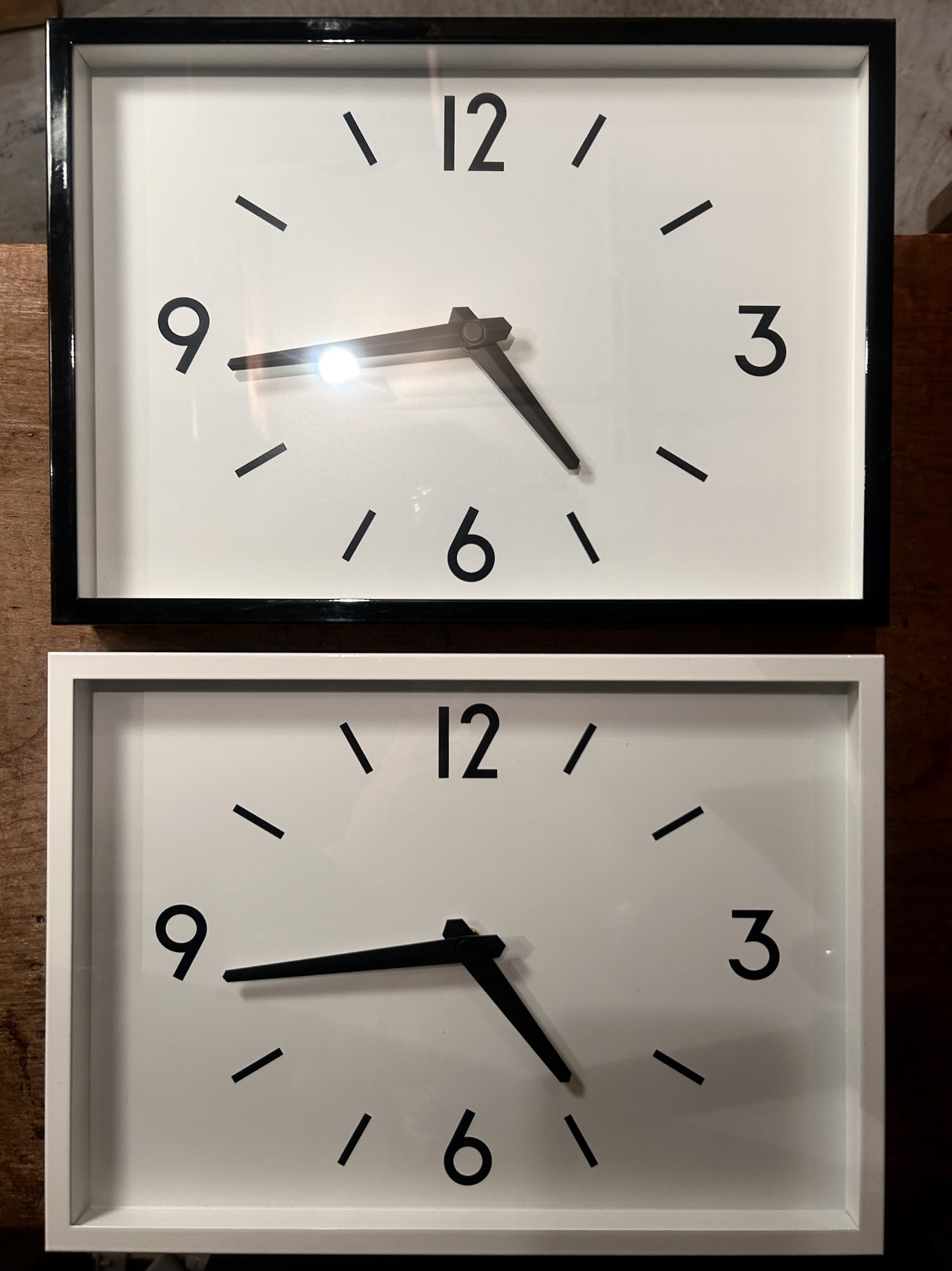 横長のスクエアな顔つき、確りした鉄製フレーム×ガラス、そして置き型にもなるスタンド付き。使用品ではありますが余り使用感は無くも無傷とは言えない程度の小さなスレ傷があるくらいなコンディション。白と黒 それぞれひとつづつございます。秒針無し 単三電池駆動 w/315 d/40 h/225ミリ
