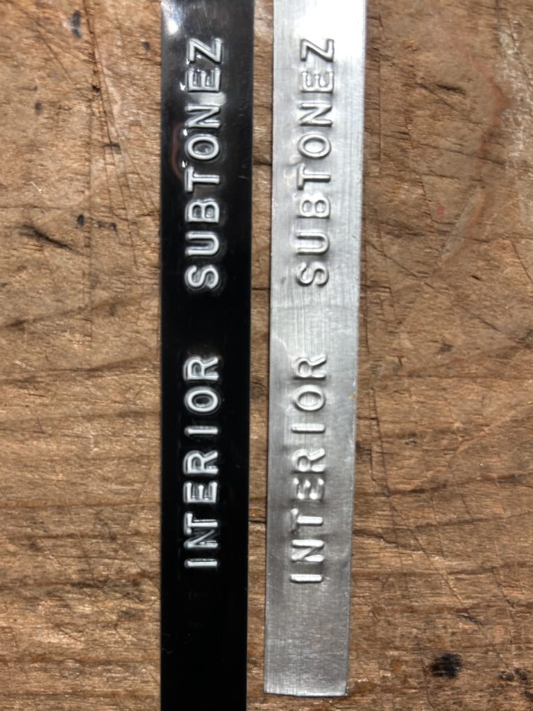 テープは12ミリ巾専用な気がします、画像ラストの4本はオマケで付いてきます。使用可能テープが現行でも入手可能です。年季の入った道具の使い方としては叱られそうですが、切り出した0.3ミリ厚位のアルミ板へ打刻してみました。なかなかカッコ良く、大丈夫な気がしますが、自己責任で宜しくお願い致します。活字ディスクは装着されている一枚のみ。