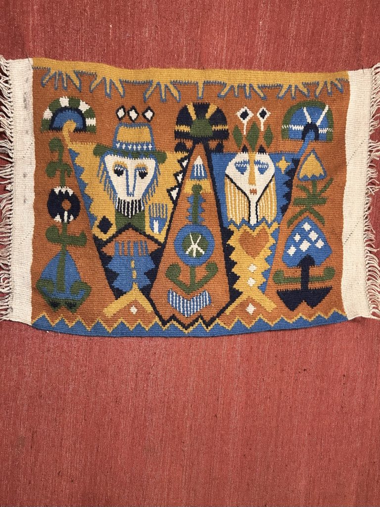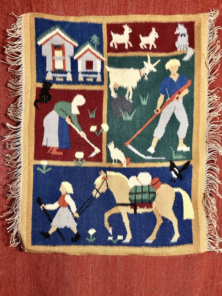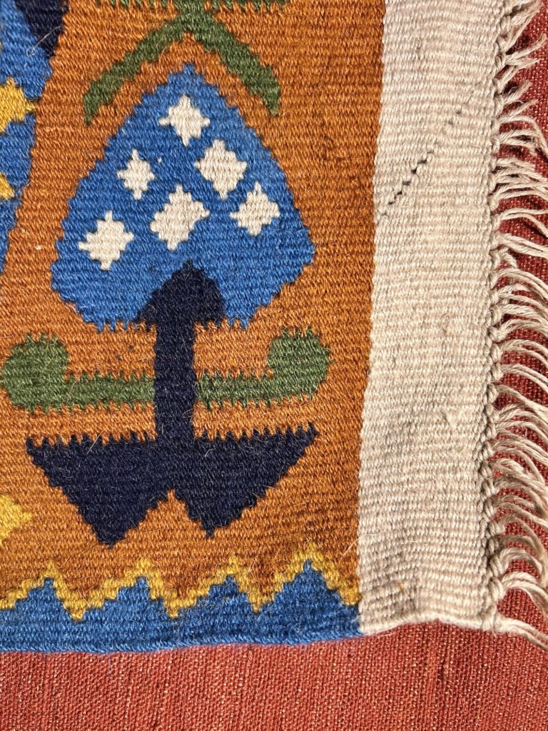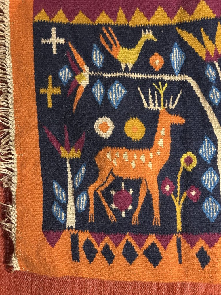 ② 男女モチーフ、何となくメキシコ感ありますがノルウェーの伝統的な織物との記事が有りました。左脇に取りきれなかった黒いシミが有ります。横 フリンジ含 540 縦 410ミリ 6.000-(税込) 配送 宅急便コンパクト