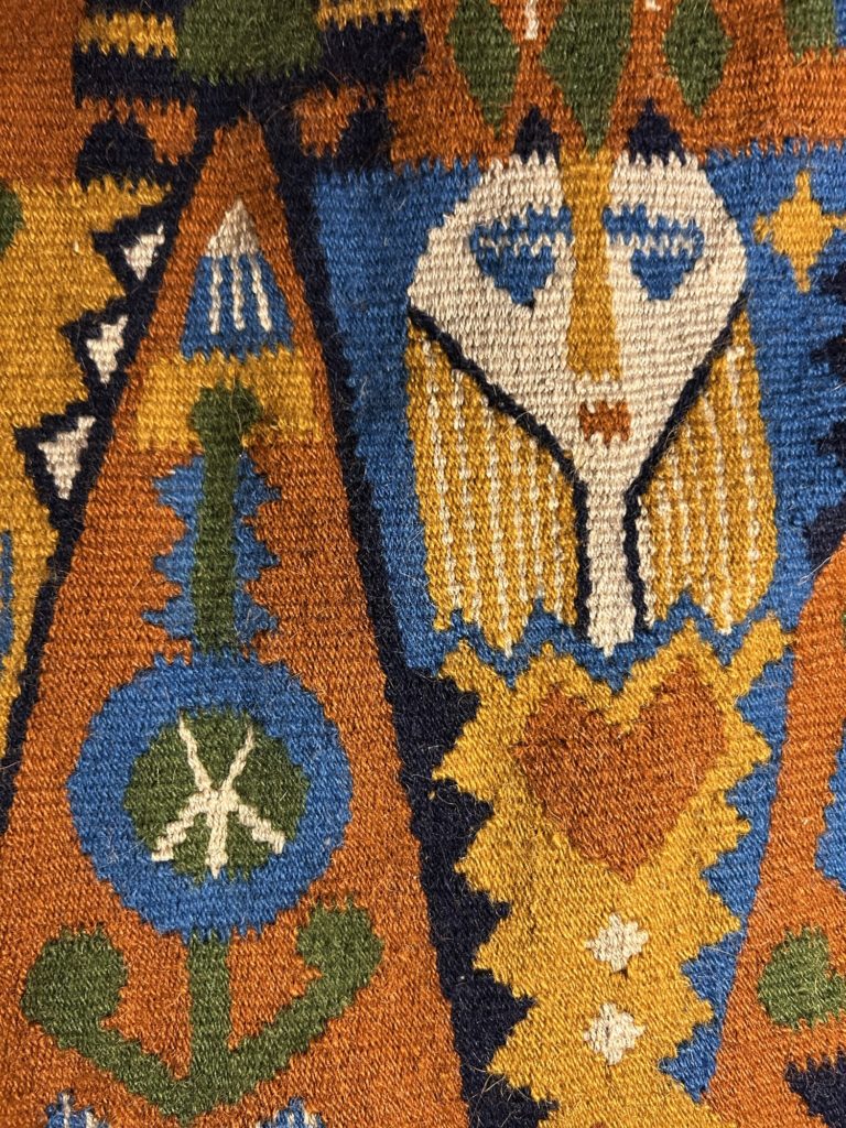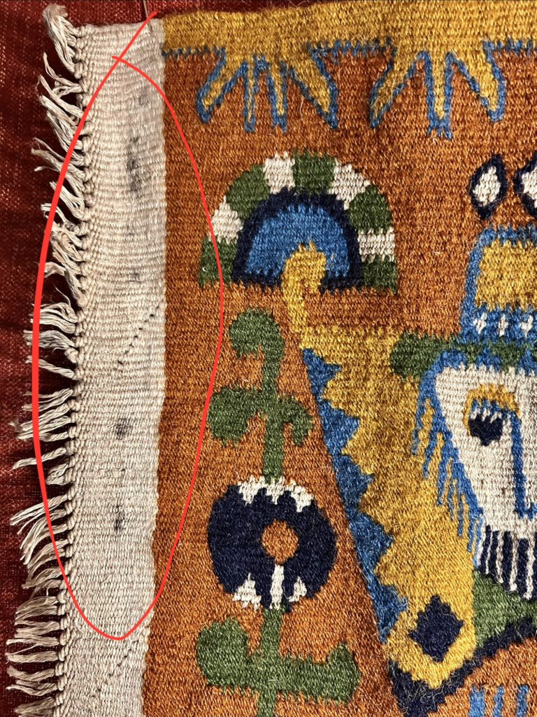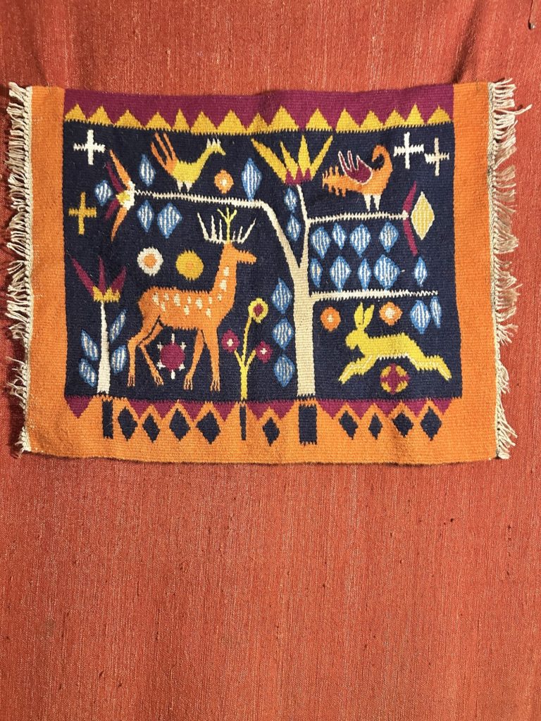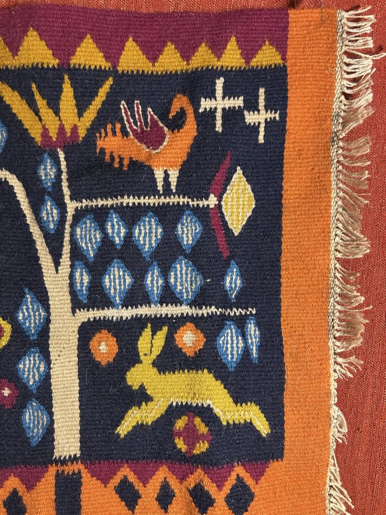 ② 男女モチーフ、何となくメキシコ感ありますがノルウェーの伝統的な織物との記事が有りました。左脇に取りきれなかった黒いシミが有ります。横 フリンジ含 540 縦 410ミリ 6.000-(税込) 配送 宅急便コンパクト
