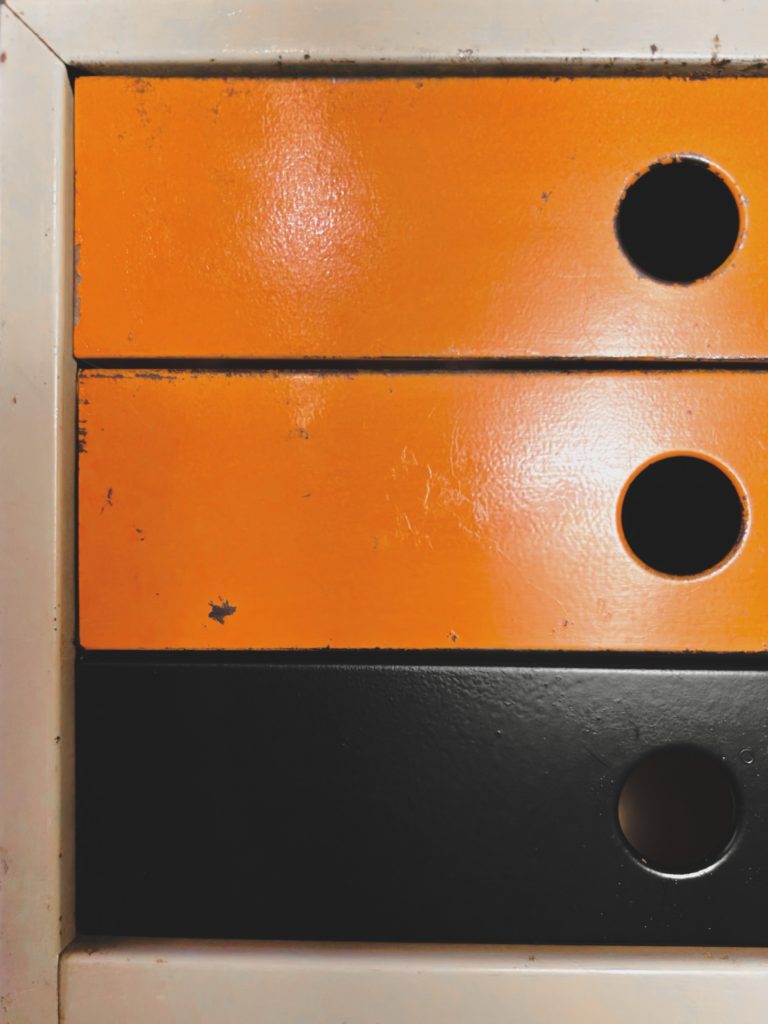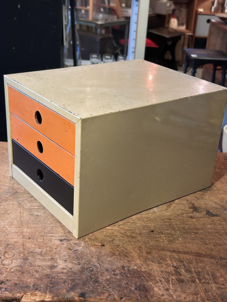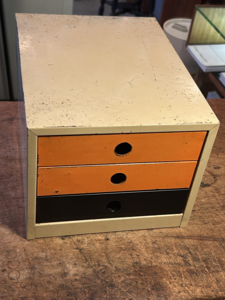 〆に相応しいのかどうかはさておき、スチールの簡素な小引き出しをピンポイントアレンジしました。僕好みのオレンジ+穴空き ですが、前一面の塗膜に重症の傷みが有りましたので、艶消し黒スプレーで塗りました。A4収まらずB5サイズが3杯。70’s頃の国産と思われ、それなりな使用感 錆がございます。w/210 d/273 h/170ミリ sold