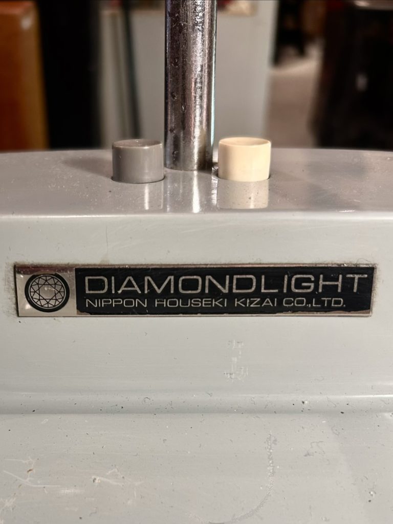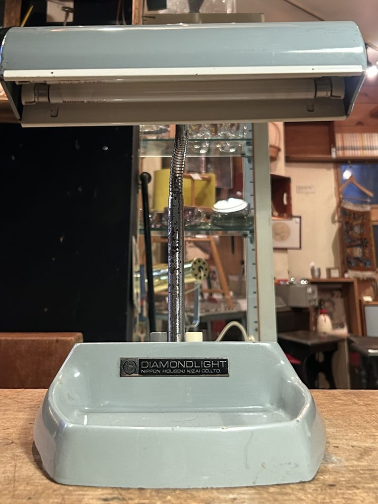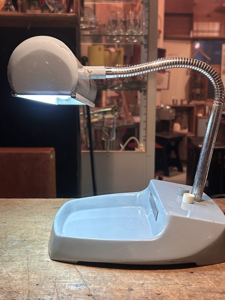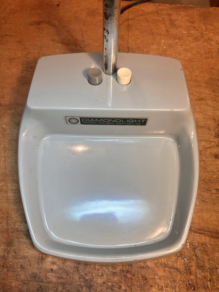 60’s旧車デザイン感が漂う昭和の卓上宝石鑑定ライト ダイヤモンドライト/ NIPPON HOUSEKI KIZAI ~と有ります。グレートーンがまた良いです。LEDの時代にこれを鑑定に使う方はいらっしゃらないと思いますが、6wの蛍光管2本仕様で本来は厳密な色温度設定の特殊管を装着し宝石鑑定用として流通していた様です。結構自在な設定ができるグースネックと意外と便利そうなトレー型金属ベース。作業用や読書灯、看板灯などなどに、LEDの光が苦手な貴方如何でしょうか。いよいよ来年蛍光灯管の製造は終了しますが、6w管は数百円でまだまだ入手できます。因みに回路はグローランプ式では有りません。コードは新品へ繋ぎ変えて有ります。