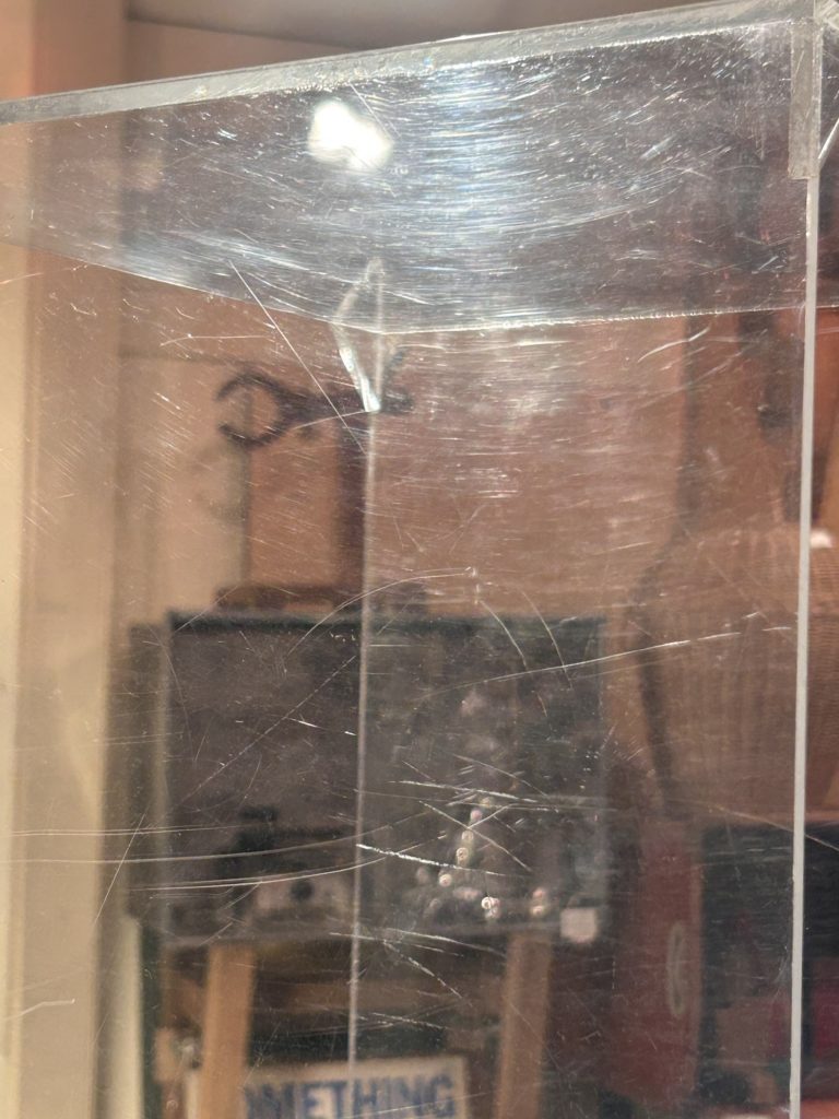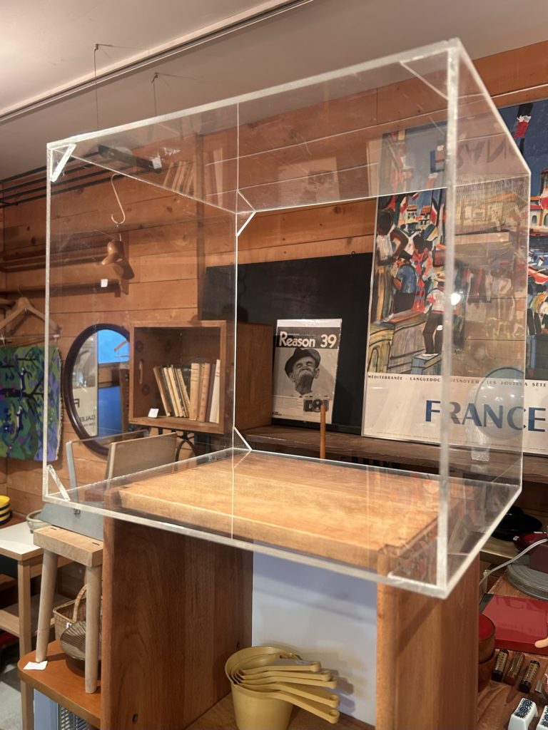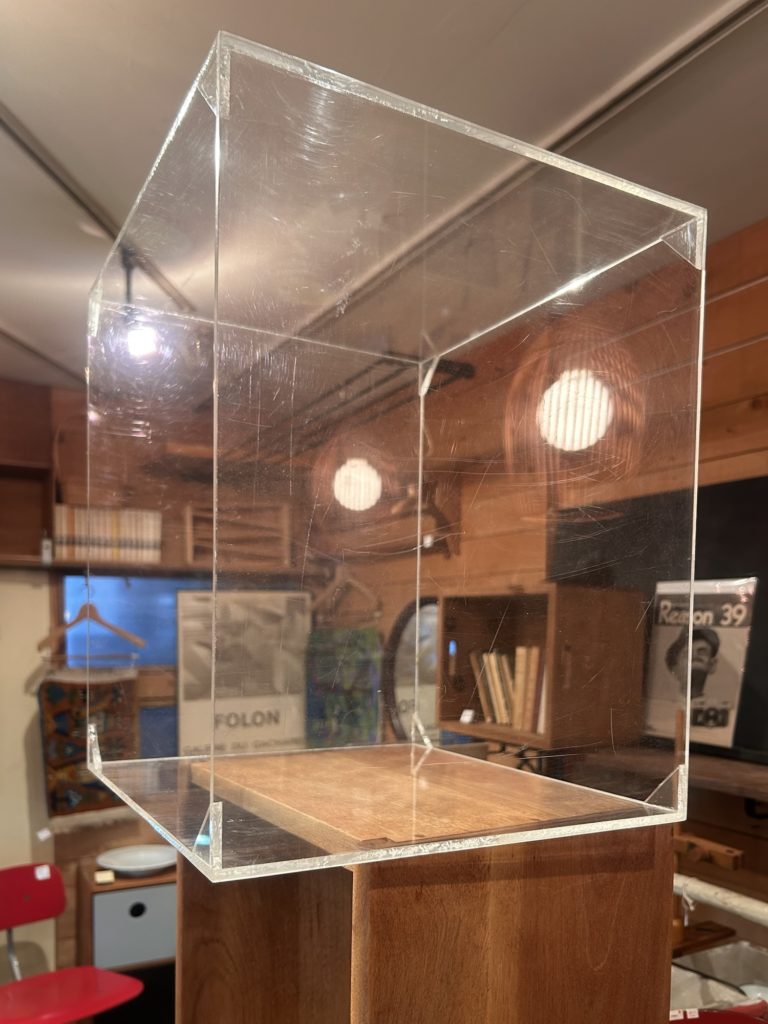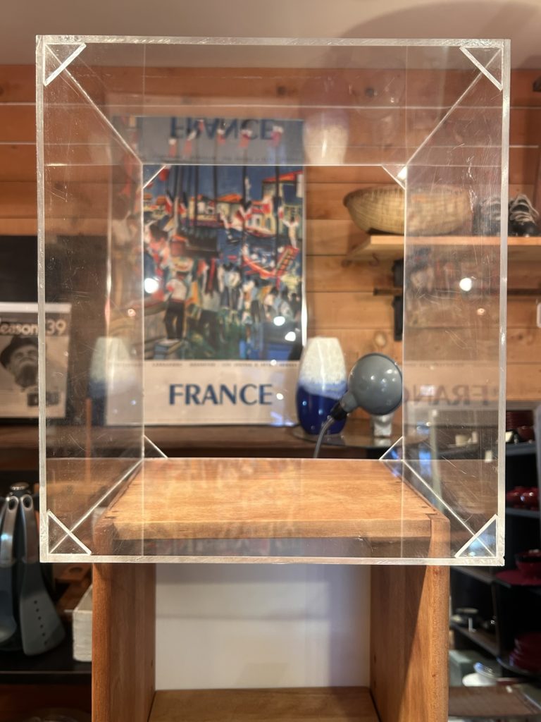 当店にしては大物が嫁ぎ、若干の模様替えに合わせてアクリルロの字箱を店内へ投入しました。何か用に誂えたのでしょう角に三角補強が入った珍しい仕様、随分使い込まれてた様で、小傷 深傷 スレ 変質 と総ざらえでは有りますが、割れ 欠けは見当たりませんでした。クリーニング後に一度磨き剤で拭き上げて有ります。サイズは画像添付画をご参照ください。 在庫 0 keep×5 (ひとつ 3.000-(税込) 配送 120サイズ〜