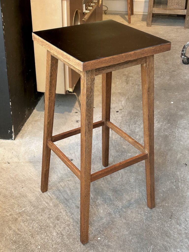 構造に弱りがありましたので一度分解し再接合、並行して荒れた塗膜をサンディングし、ミディアムオークのオイルで仕上げました。天板部は黒のメラミン板へ張り替えました。ストック材を使用した為か、小傷が少々ありました(8枚目)光の加減で判る程度では有ります。花台や机の脇に、ベッドサイドにも如何でしょう。295×295 h/ 605ミリ sold