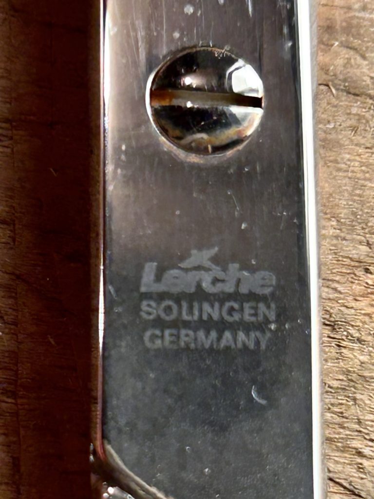 メタルのホルダー付き、刃先鋭く切れ味抜群さすがドイツ刃物村から。上質なメタル製のホルダー付きですが、セットであったらしきペーパーナイフは欠品してますのでお安めにこちらは sold