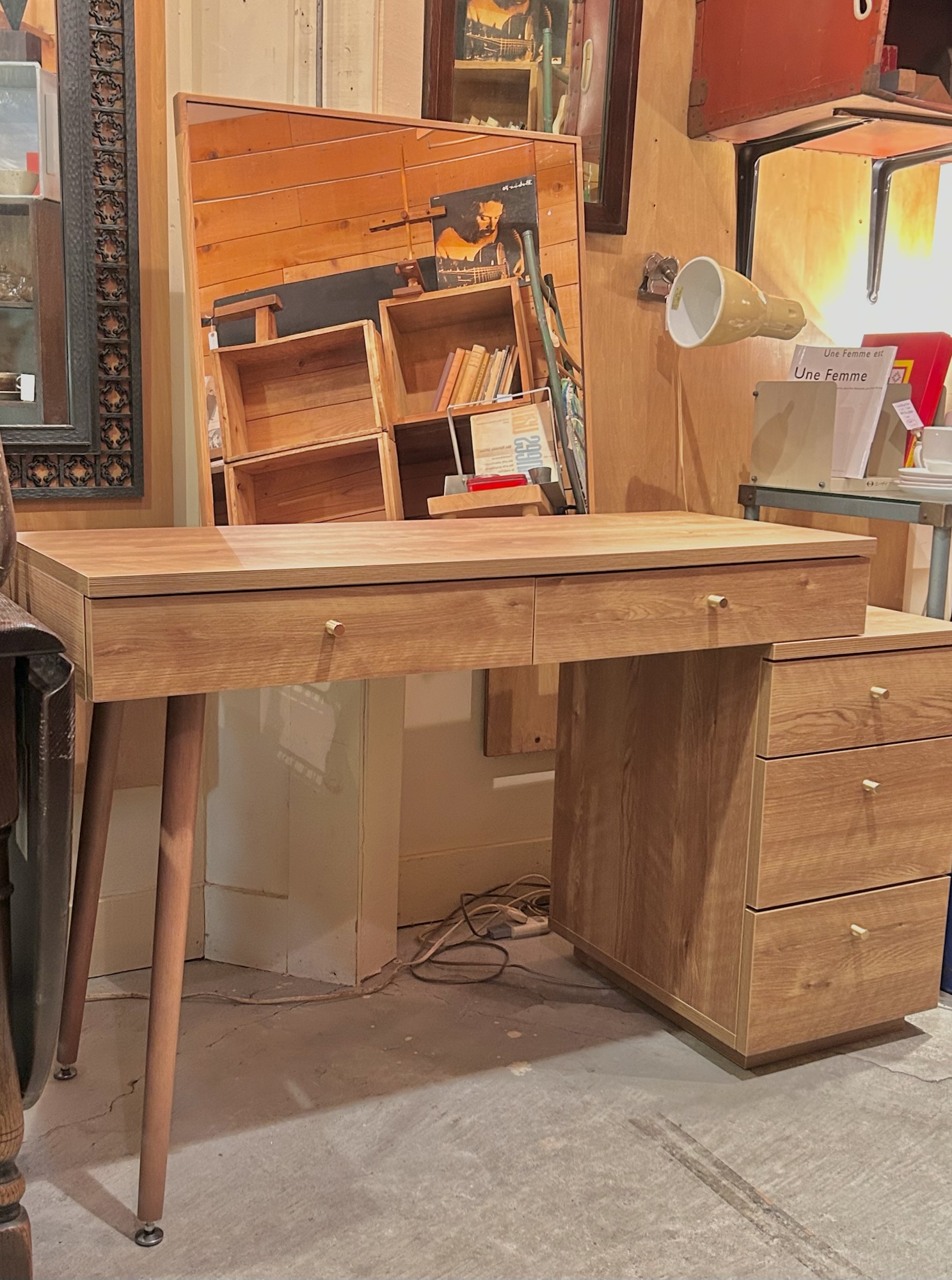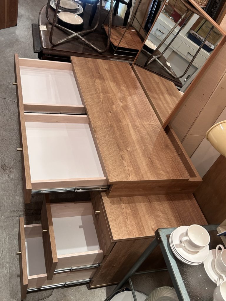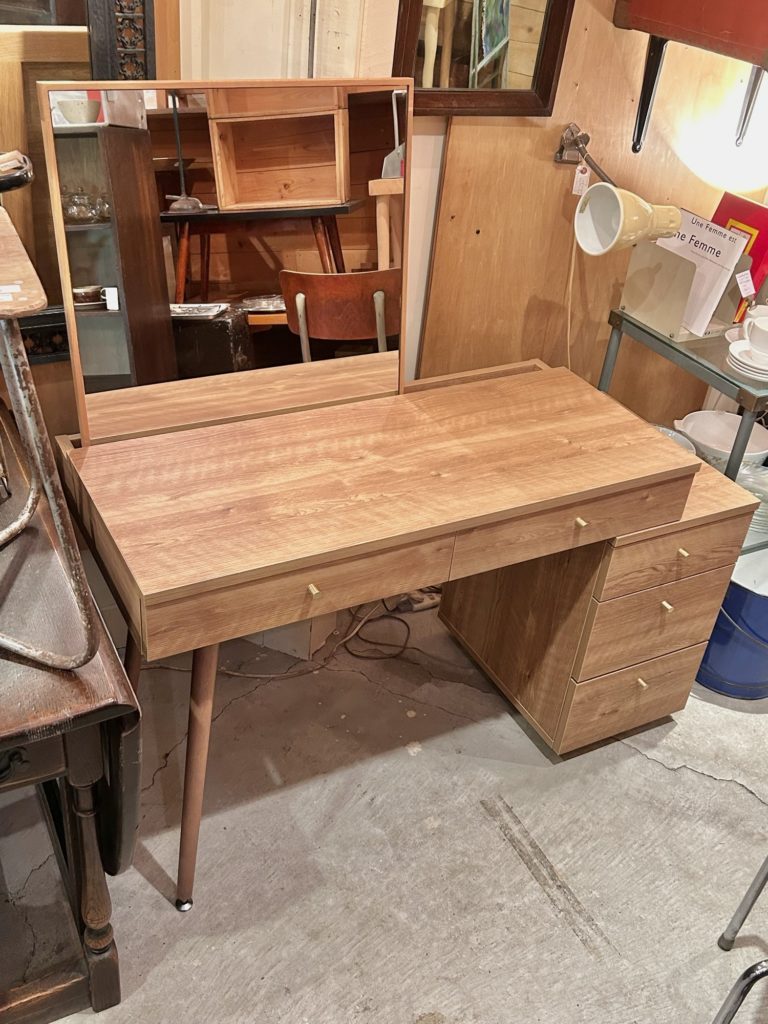 控えてるガラスたちはひと休み、サブトーンズではちょっと珍しいかもな現行品で日本のメーカー LOWYA のドレッサーデスクのご紹介。殆ど使用感は感じず、非常に綺麗な状態です。正方形の鏡はデスク奥のスリットへ置くだけのセパレート式でそれぞれ単体でもお使い頂けますが、鏡を壁へ掛ける場合は何らかな追設が必要になります。また、デスク奥のスリットへはコンセントタップや電源周りを収められすっきりと使えます。沢山装備されている引き出しは全てレール仕様ですので使い勝手も収納力も抜群。色はシャビーナチュラル、把手のシャンパンゴールドとの合わせが上品です。