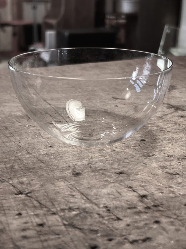 そしてこちらもノークレジットですが美しいボウル。口縁は研いで有ります。手吹きなのでしょう、厚み 重さに個体差が感じられます。複数有ります(小さなダメージ有の格安含)径 125 高 60 @2.000-
