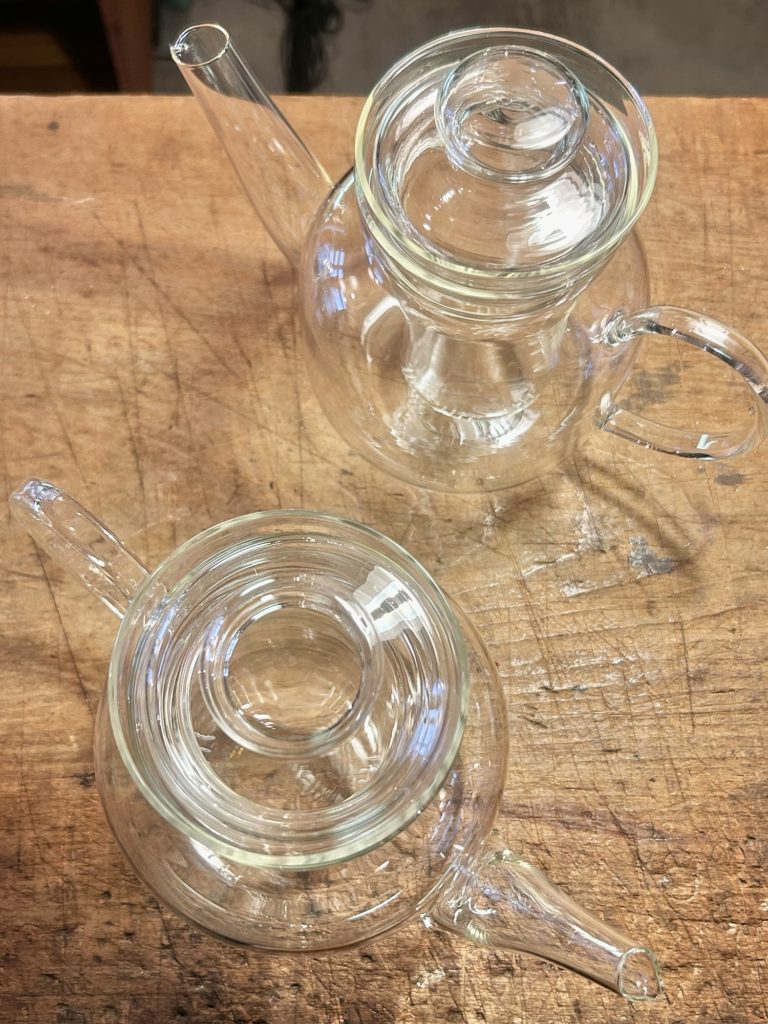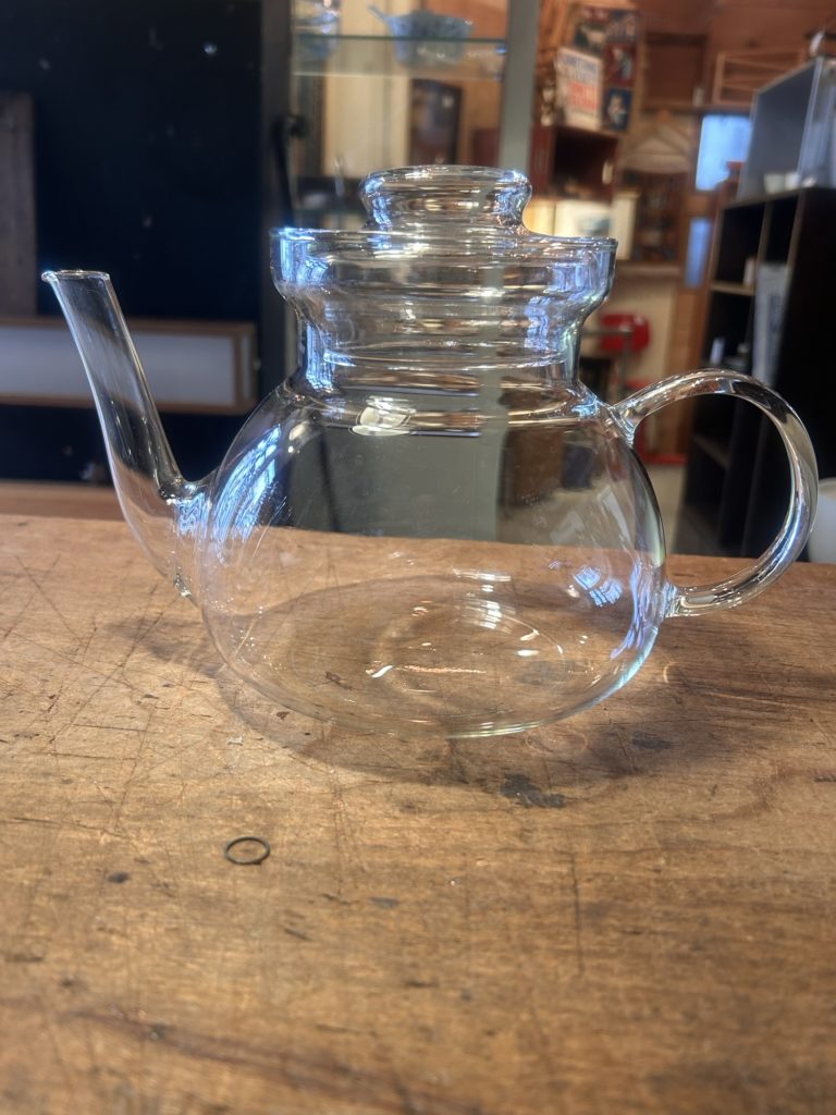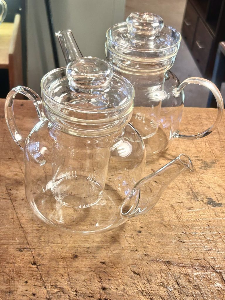 schott mainz /JENAer GLAS の大柄なポットがほぼ同一モデル(注ぎ口形状に若干の違い有り)で2台。片方のスタンプがだいぶ擦り切れている以外は同コンディション、こちらも使用感無く良好なコンディションです。w/240 d/130 h/175 @12.000-