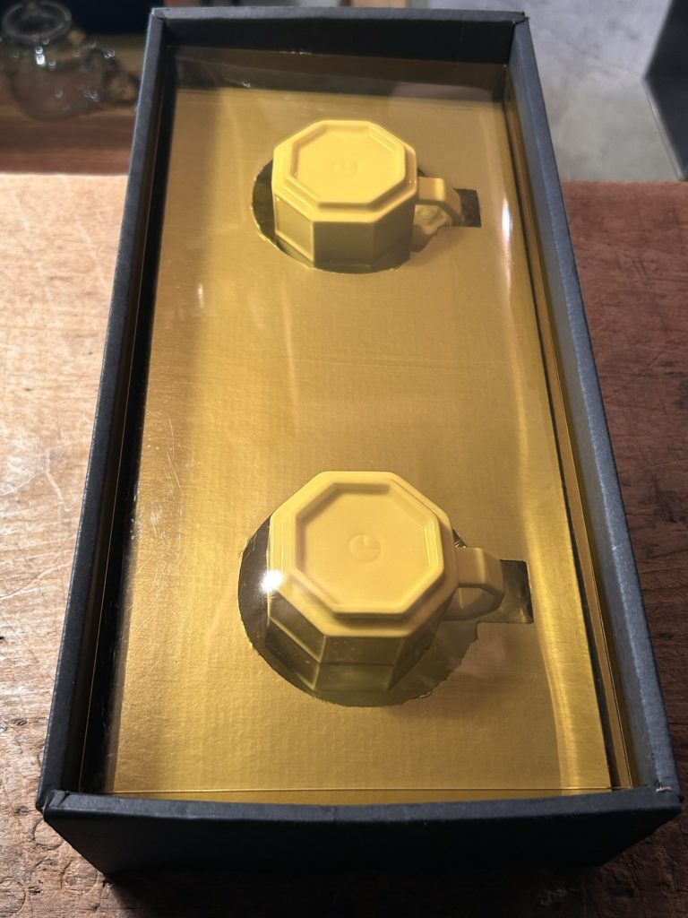 そんなタイムスタジオのグリッドシリーズよりC&Sのペア、恐らく80年代初頭辺りの未使用品 デッドストック箱付きになります。八角形とグリッドで構成されており、クラシックさとモダンさが共存してます。