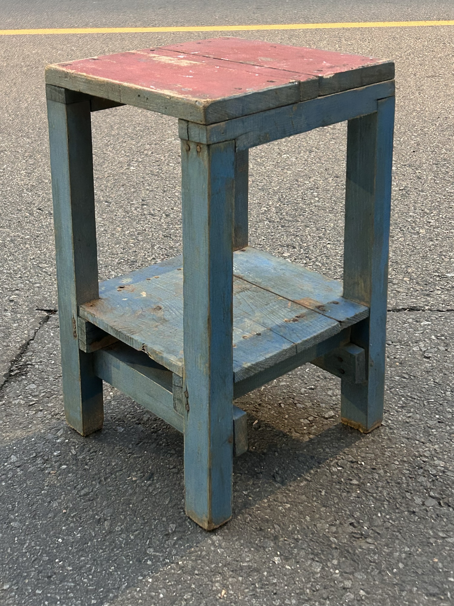 木曜日20時迄。金曜日は一回休みます。赤×青の古い積み木みたいな角スツールです。