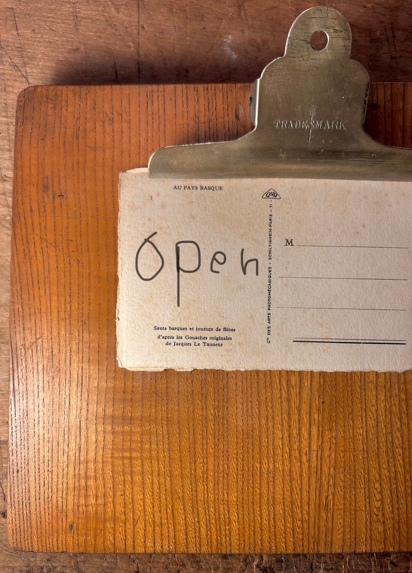 三連休との事、月曜まで連日営業致します。好天の本日土曜日19時迄おりますのでどうぞお寄り下さい。 国産古手で木製のバインダー。クリップは上半分真鍮製ぽいです。引っ掛けられます。挟んだ紙はポストカードサイズ、A4だとちょっ… 続きを読む 古手の木製バインダー。連休中は月曜まで三連荘営業です。